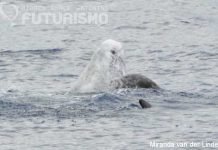 Grupo de golfinhos comuns e pintados do Atlântico filmados debaixo d’água por Maite Goenaga na tarde de 01 de julho.