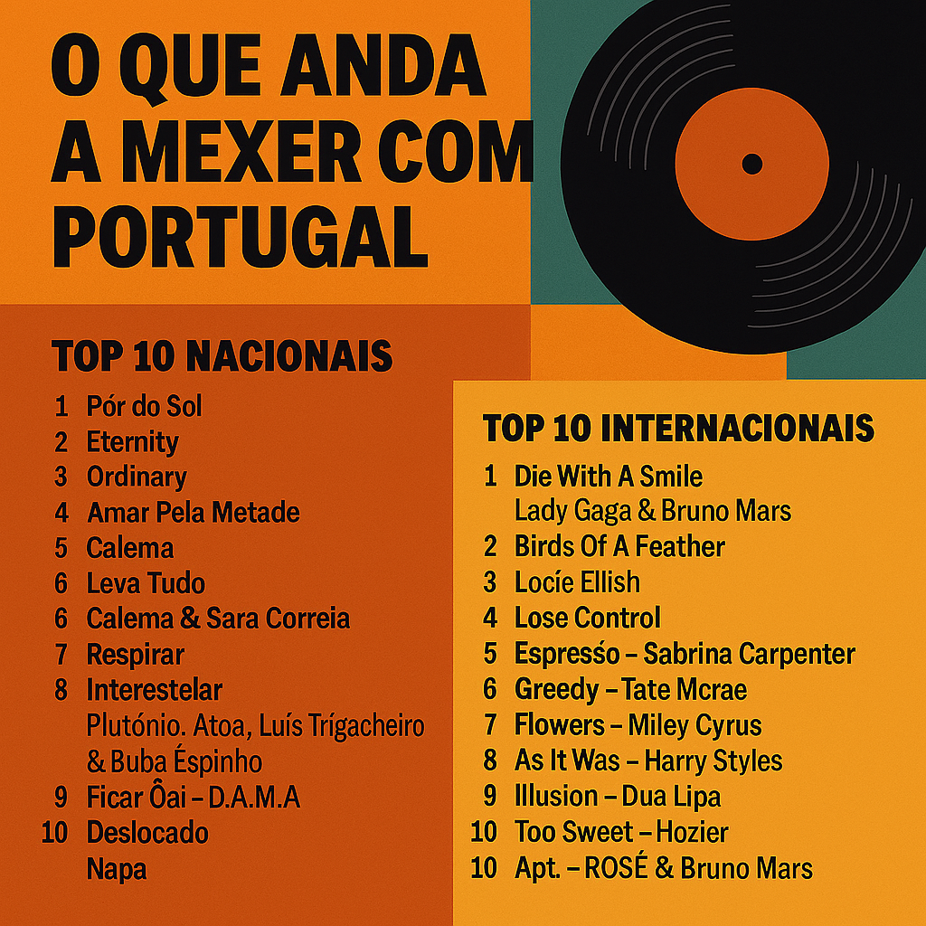 Entre lançamentos nacionais que respiram identidade portuguesa e hits internacionais que chegam com força das tendências globais, a nossa playlist desta semana é um verdadeiro reflexo do que anda a mexer com os ouvidos e emoções de Portugal. Dos ritmos urbanos que continuam a marcar presença nas plataformas digitais, à nova geração de vozes portuguesas que mistura tradição com modernidade, somam-se também os temas estrangeiros que não saem do top mundial — pop, reggaeton, baladas intensas e vibes dançáveis que não passam despercebidas. É neste cruzamento entre o que é nosso e o que vem lá de fora que nasce a seleção das Top 10 músicas nacionais e Top 10 internacionais destas duas semanas. Um resumo do que anda a ser ouvido, partilhado, sentido e repetido vezes sem conta.